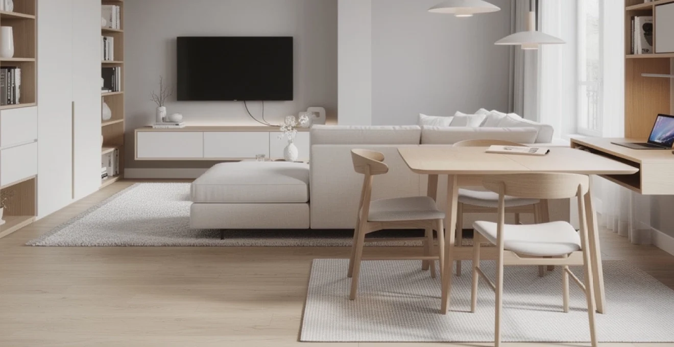 Concrètement, chaque triangle doit permettre d’accéder à ses fonctions principales en quelques pas, sans contourner de meuble massif ni empiéter sur un autre usage. Vous évitez ainsi les situations où l’on doit traverser l’espace TV pour aller à table, ou couper la zone de discussion pour rejoindre le bureau. Cette approche méthodique permet de transformer 25m2 en un véritable plateau multifonction, mais parfaitement lisible.