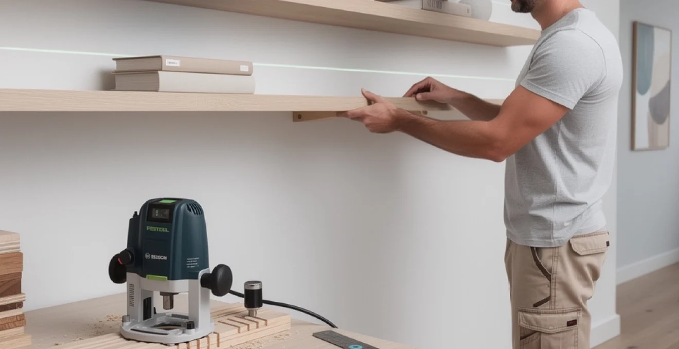 L’usinage de la rainure arrière est le cœur du système de tasseaux invisibles. La défonceuse, par exemple une Festool OF 1010, offre une combinaison idéale de puissance et de précision pour réaliser cet usinage. Guidée le long d’un rail ou d’une règle parfaitement rectiligne, elle permet de créer une gorge continue, régulière et parfaitement parallèle au chant du plateau. C’est cette précision qui garantit l’emboîtement serré de l’étagère sur son tasseau mural.