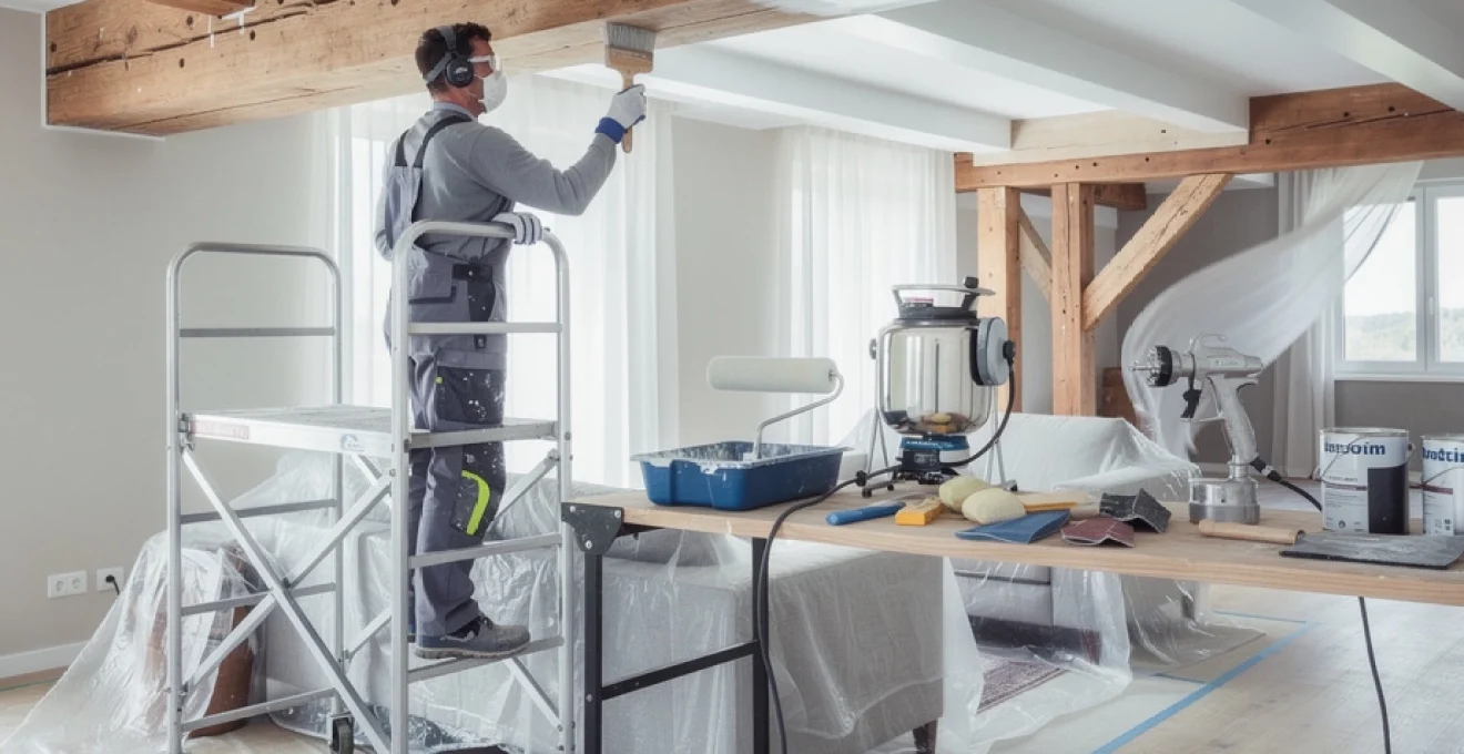 Les murs adjacents, les fenêtres, les radiateurs et les luminaires doivent également être masqués si vous appliquez la peinture au pistolet ou travaillez avec des produits très fluides. Un masquage bien réalisé vous permet ensuite de peindre plus sereinement, sans crainte de débordements, et limite nettement le temps de nettoyage en fin de chantier. Pensez aussi à protéger vos propres vêtements, cheveux et chaussures : sur un chantier de poutres, la peinture tombe autant sur le sol que sur l’opérateur.